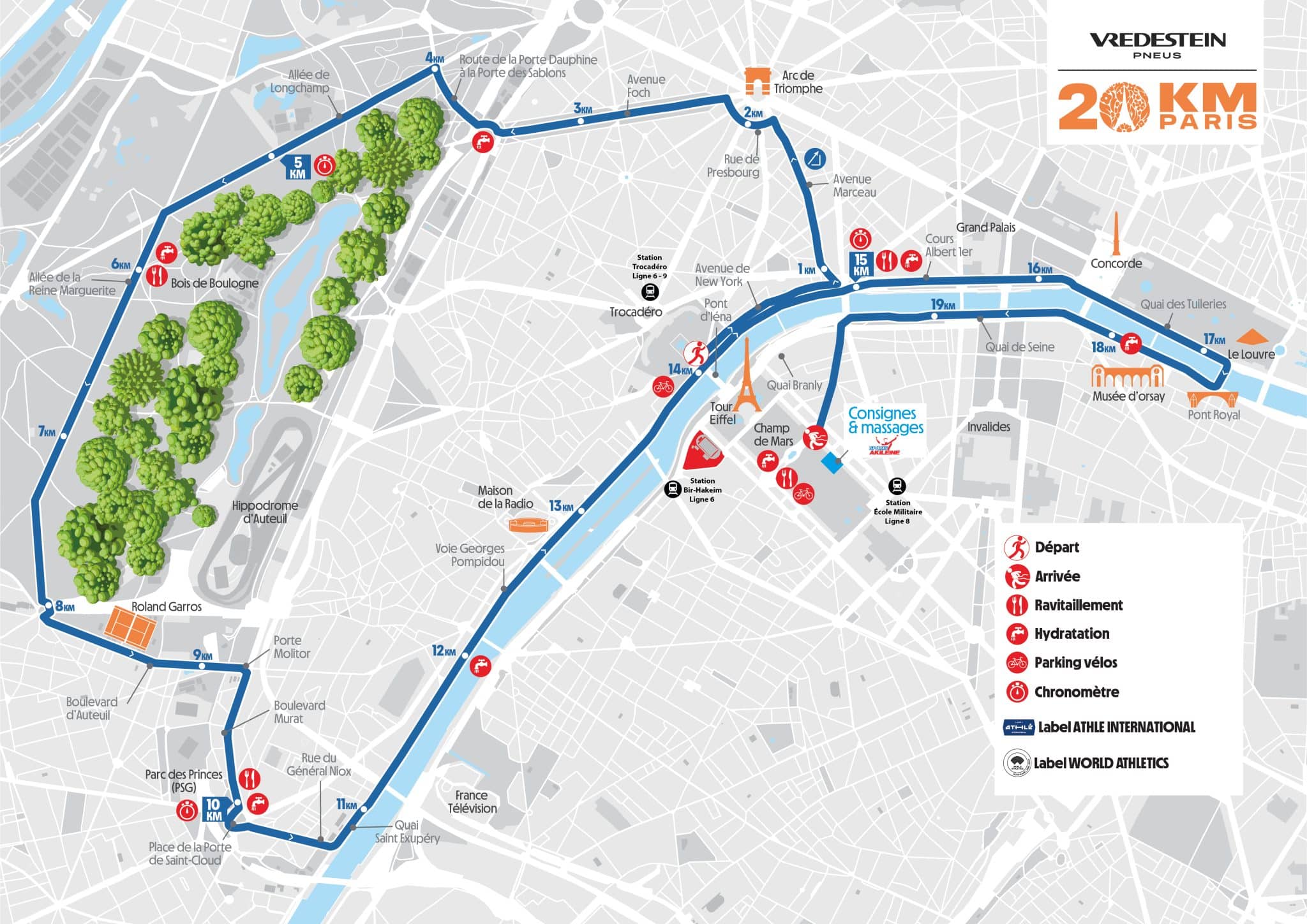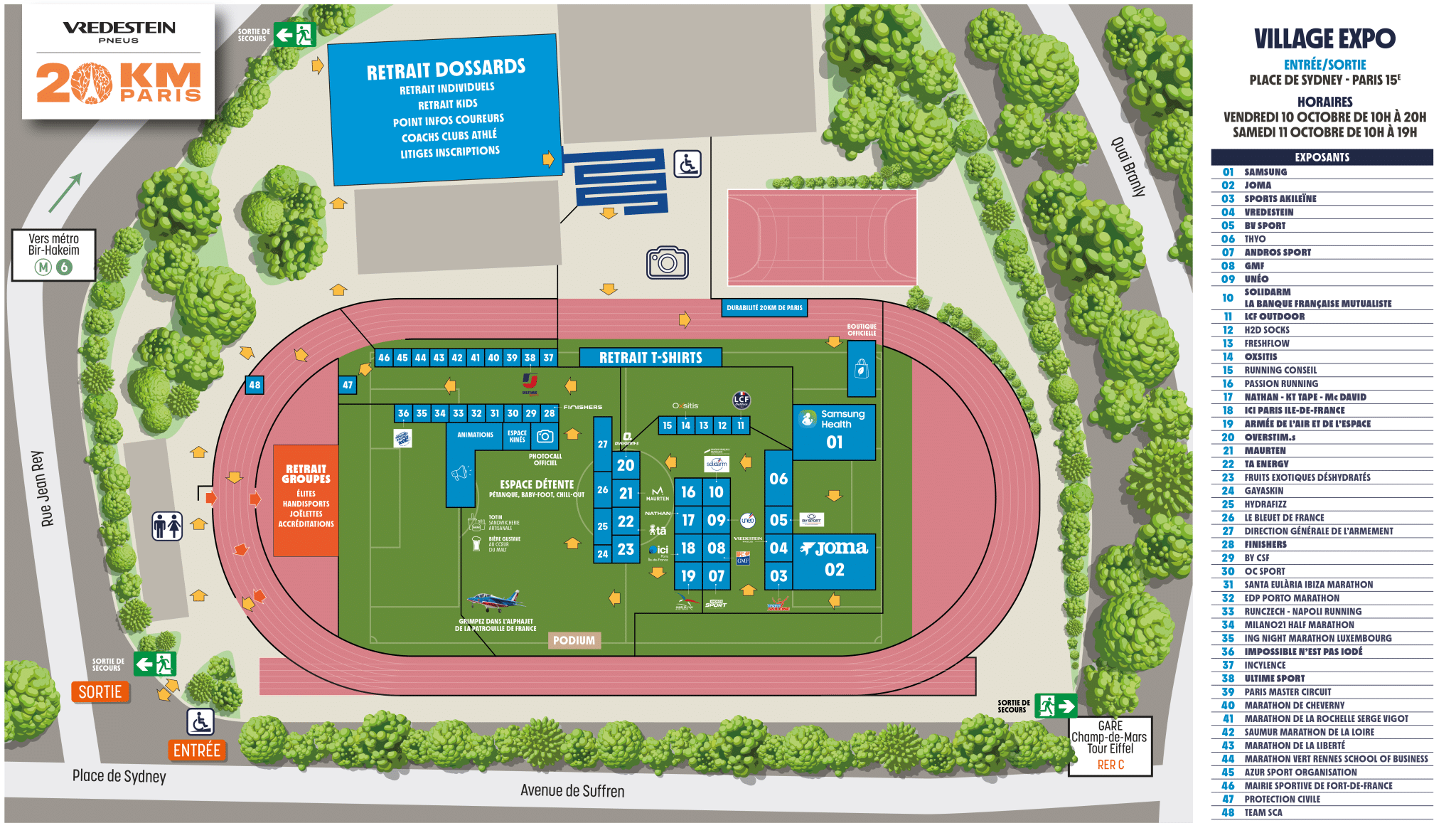 Les dossards seront à retirer au village des Vredestein 20km de Paris, au stade Emile Anthoine, Place de Sydney 75 007 PARIS.