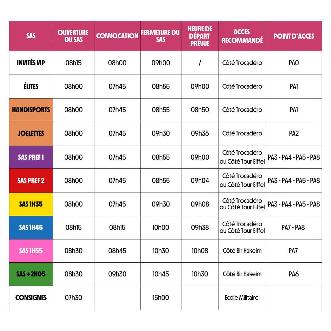 Notez également l’heure de convocation recommandée ainsi que le point d’accès recommandé, indiqués dans le tableau ci-dessous :