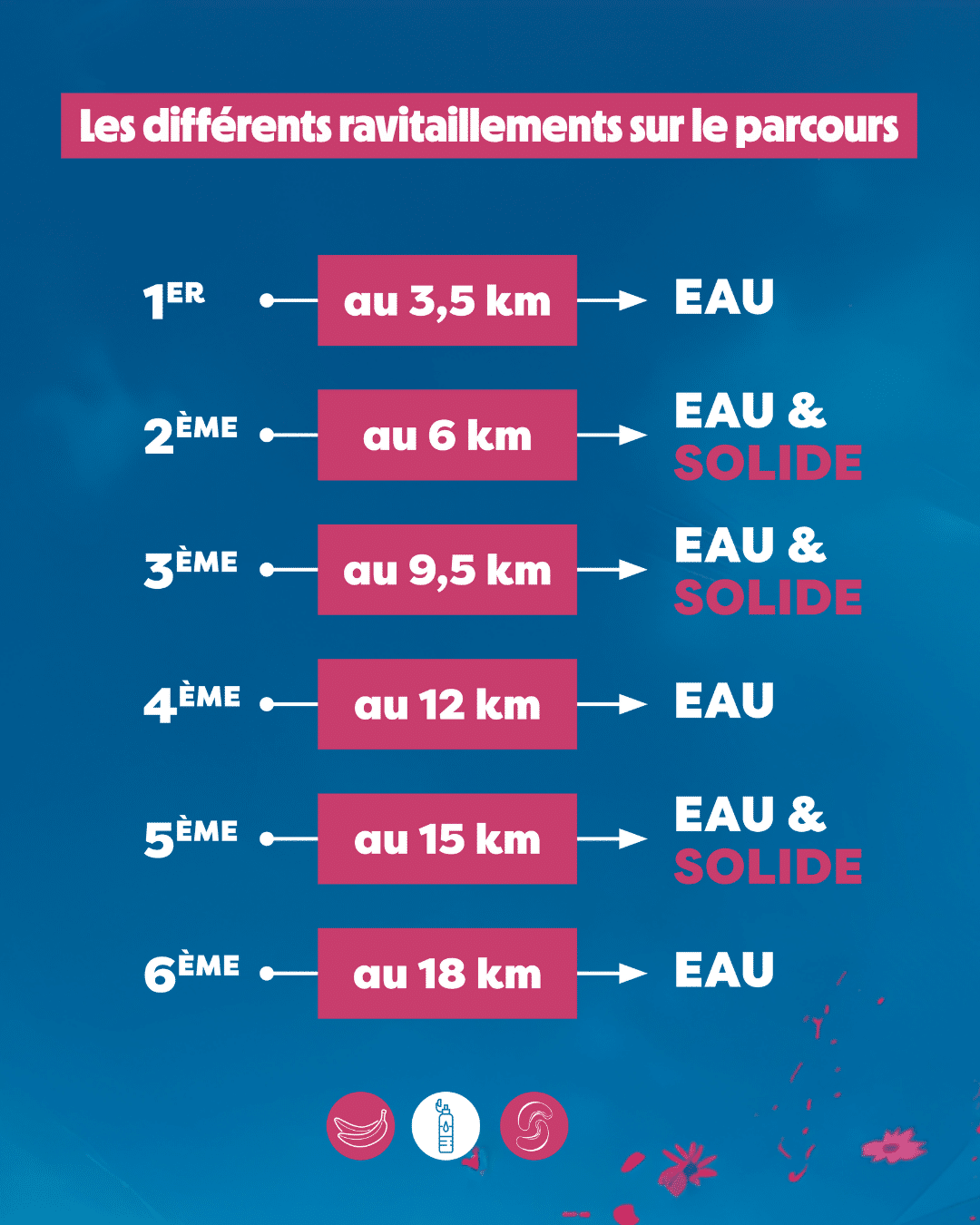 Des zones de ravitaillement et d’hydratation seront aménagées aux kilomètres 3, 6, 10, 12, 15 et 18, ainsi qu’à l’arrivée.