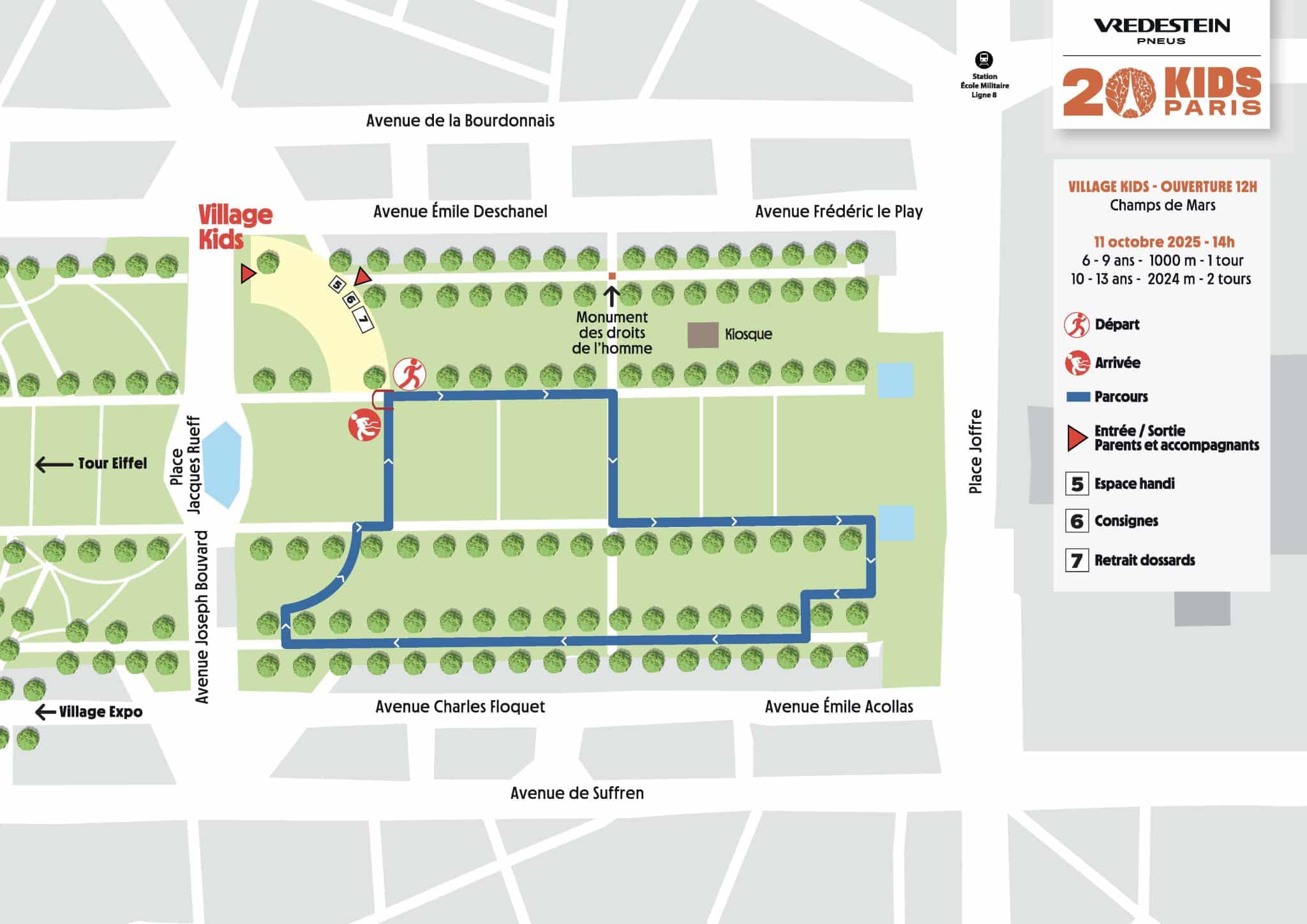 La Course Kids des Vredestein 20km de Paris se tiendra le samedi 11 octobre 2025 au Champ de Mars, point de départ et d’arrivée.