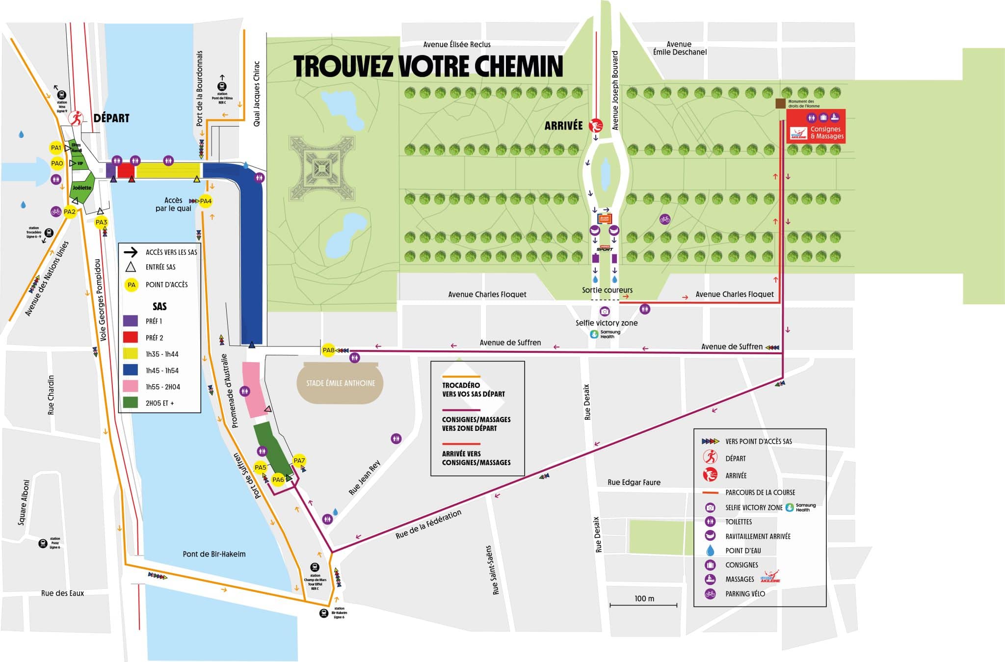 Retrouvez ci-dessous le plan d’accès aux SAS de départ des Vredestein 20km de Paris 2025, pour vous orienter facilement et rejoindre votre zone de départ en toute sérénité :